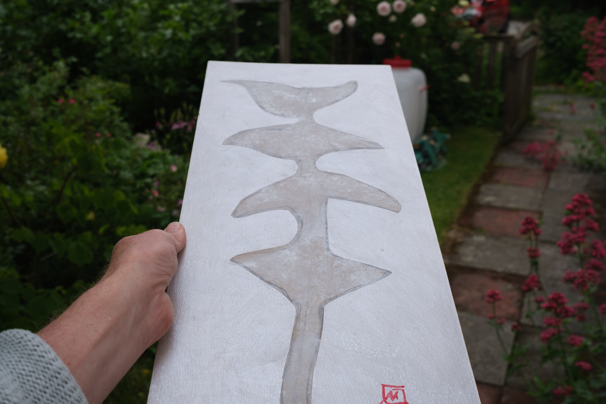 Rasch gezeichnete Figur aus Papier, ausgeschnitten und auf eine pigementierte 3mm MDF-Platte montiert.